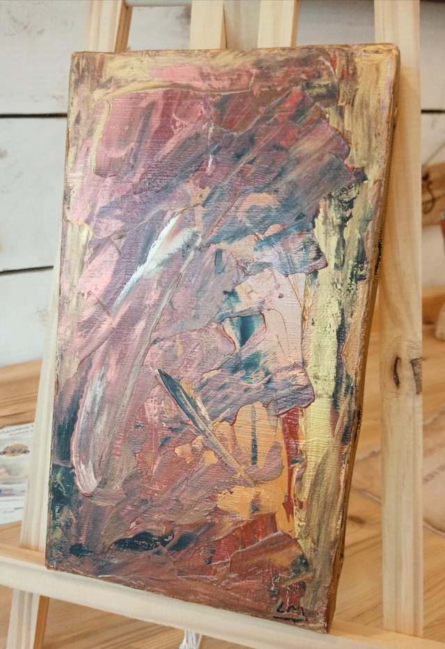 Peinture abstraite en acrylique or et cuivré sur toile de lin de l'artiste Marylène Latte. Dimensions 16X27, oeuvre unique